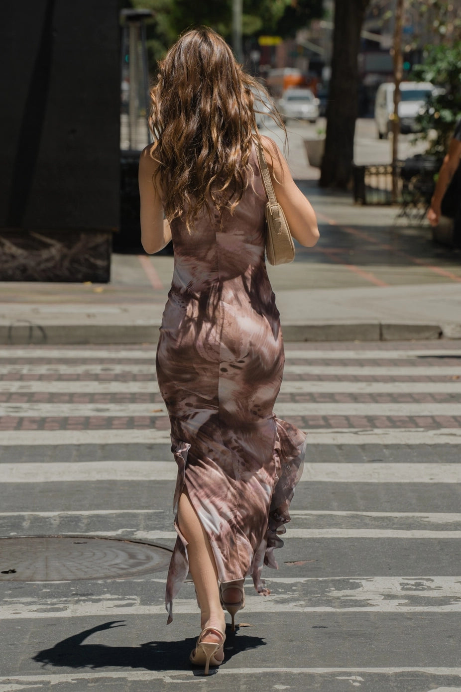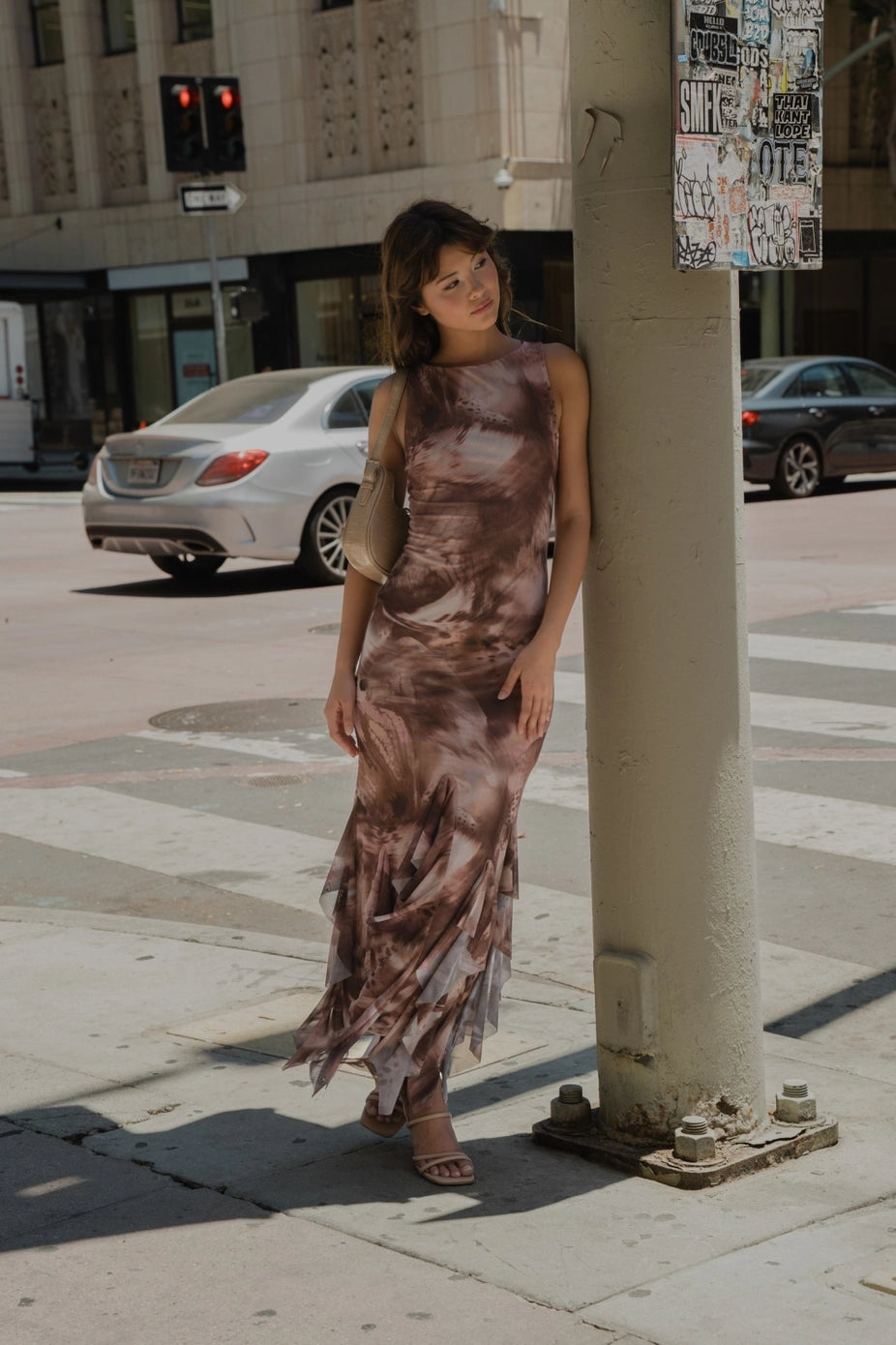 Romantic and ethereal, this mesh maxi dress features soft ruffle detailing that cascades for added movement and texture. Light and airy with a dreamy silhouette, it's perfect for special occasions or when you want to make an effortlessly feminine statement