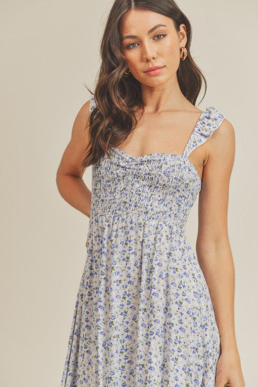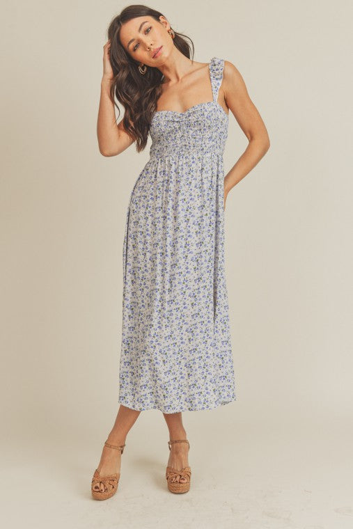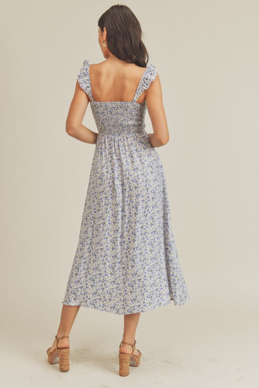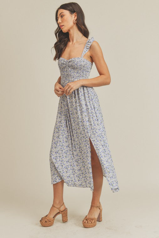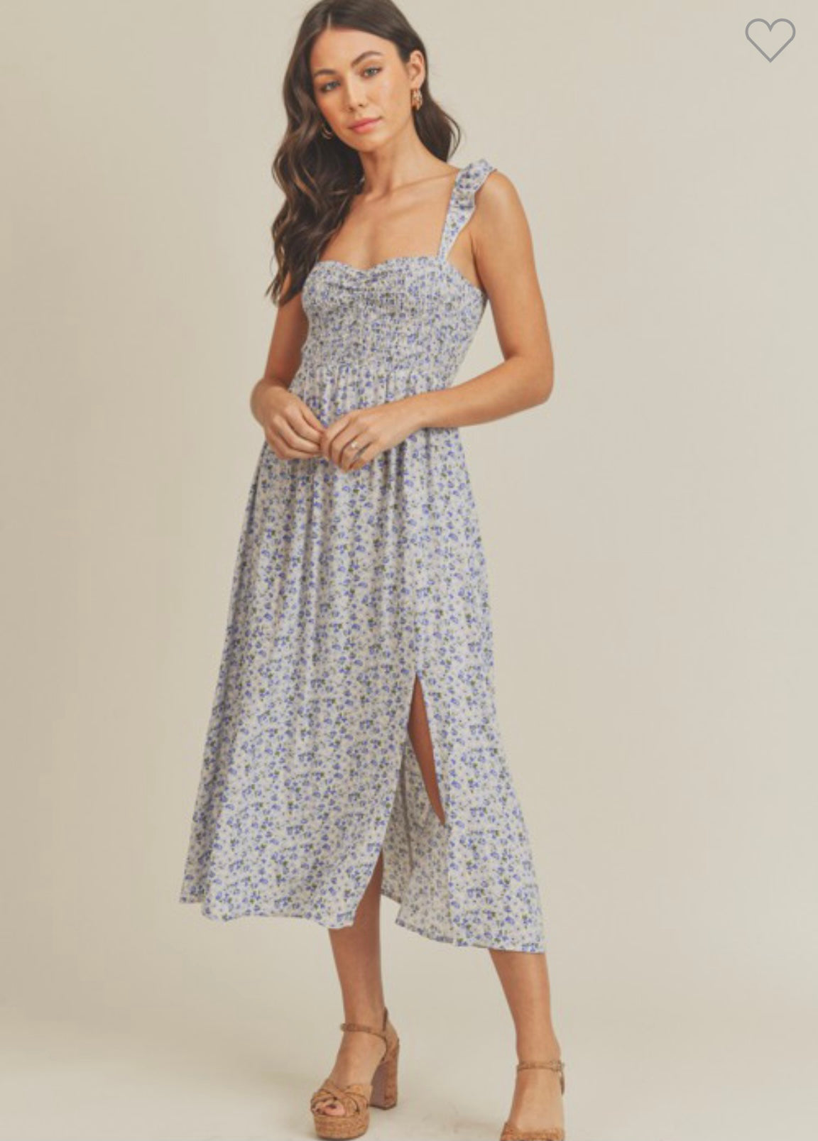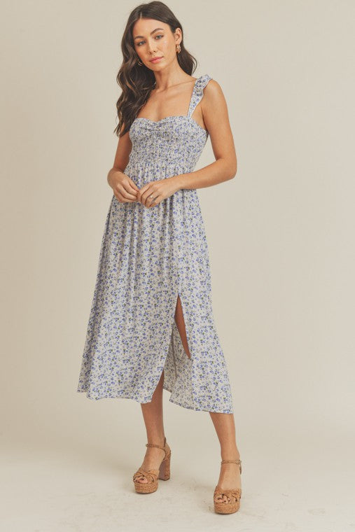 Floral Print Midi Dress -Smocked bodice detail -Side slit -Sleeveless Care instructions: HAND WASH COLD, DO NOT BLEACH, DO NOT TUMBLE DRY, DRY FLAT, LOW IRON IF NEEDED