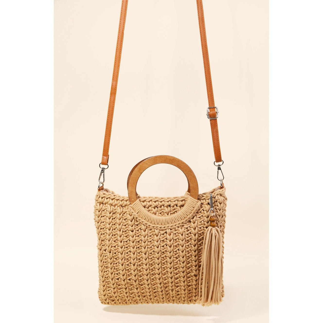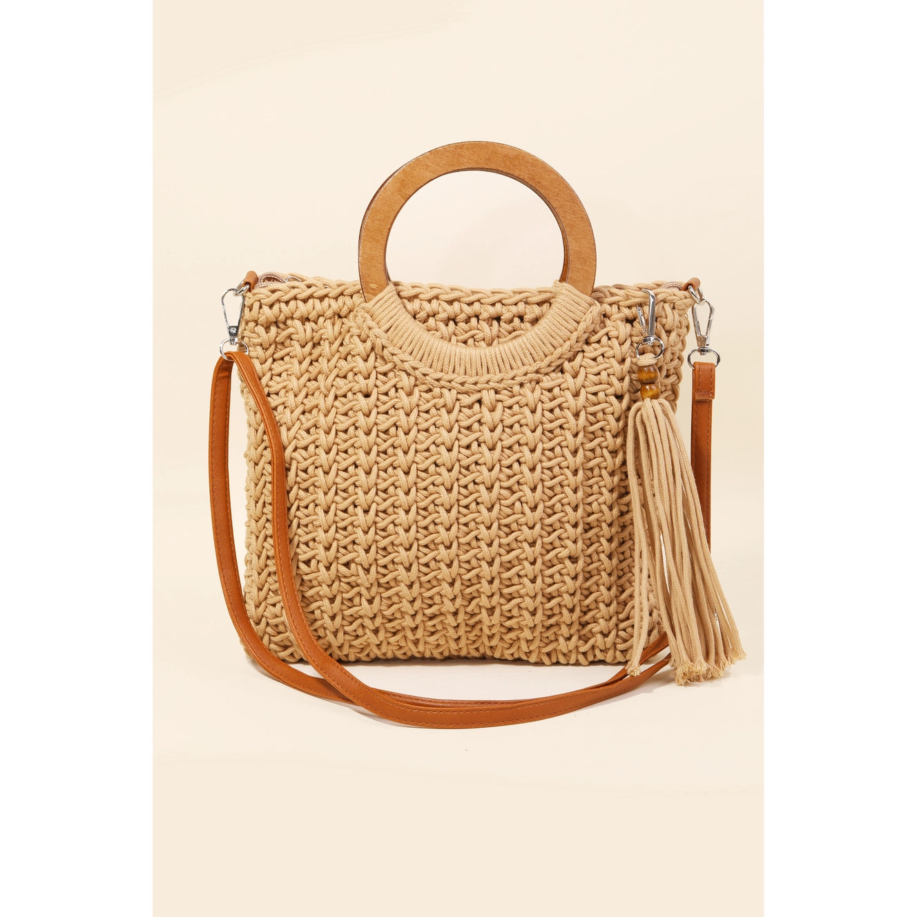 This piece is perfect for those who want to showcase their unique style, this tote bag includes a stunning hoop handle crochet knit design. It also includes a leather strap. Achieve a perfect blend of style and sophistication with this versatile accessory, a fashion-forward choice for any occasion.