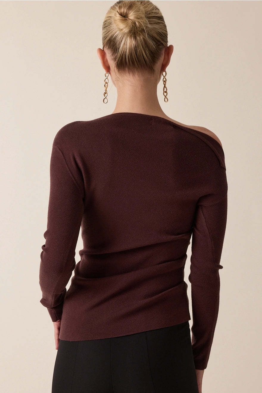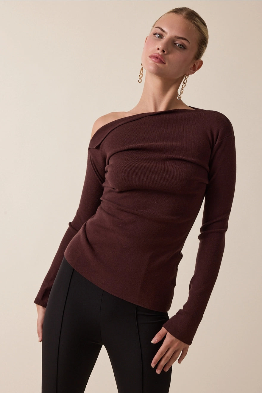 Solid Color One-Shoulder Fold Point Long Sleeve Ruched Side Point Casual Knit Sweater Top SELF:50%VISCOSE/25%NYLON/25%POLY