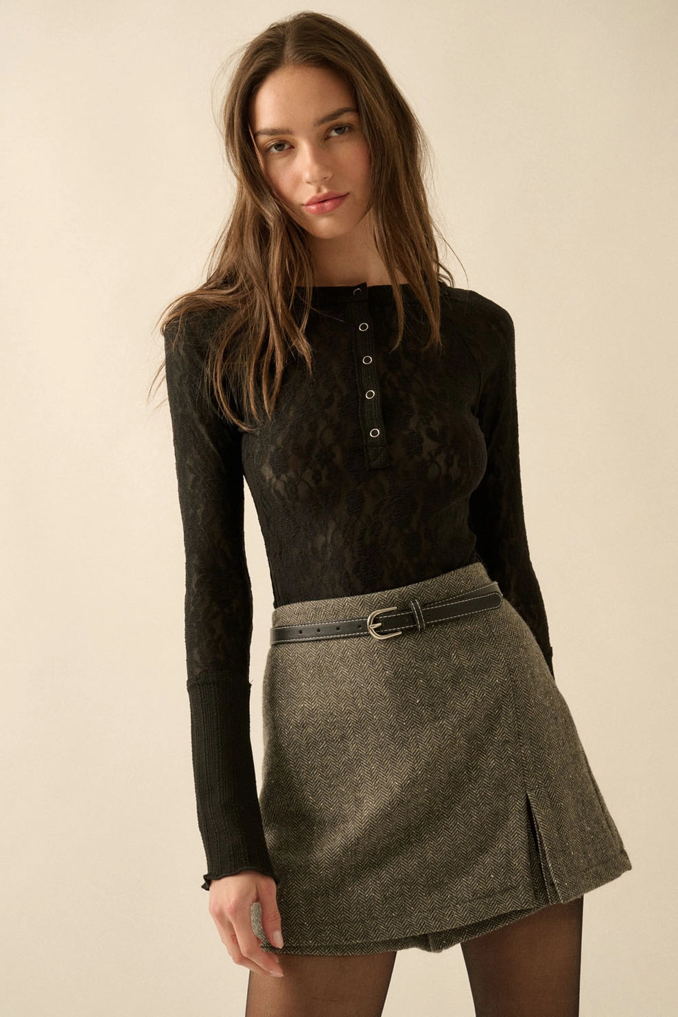 A floral lace top with the following features: Round neckline with rib-knit trim. Half-snap henley closure. Long raglan sleeves. Split cuffs in contrasting rib-knit. Lettuce-edge hem. Sleeveless lining. Fitted silhouette.